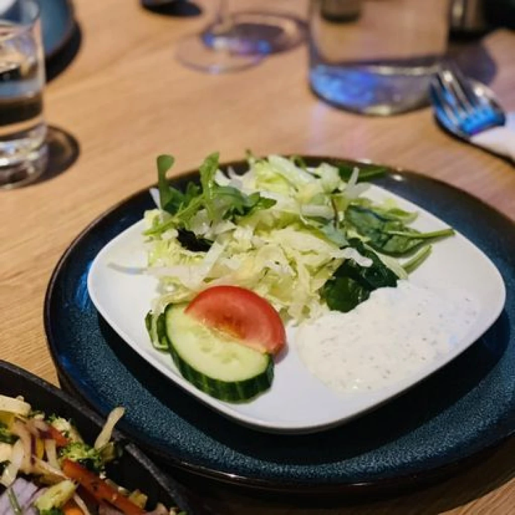 Grillade köttfärs, marinerade i tandoorikryddning, serveras med sallad och masalasås